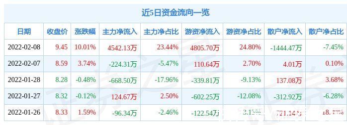 资金流向数据方面,上个交易日主力资金净流入4542.13万元,游资资金净流入4805.7万元,散户资金净流出1444.47万元。近5日资金流向一览见下表: